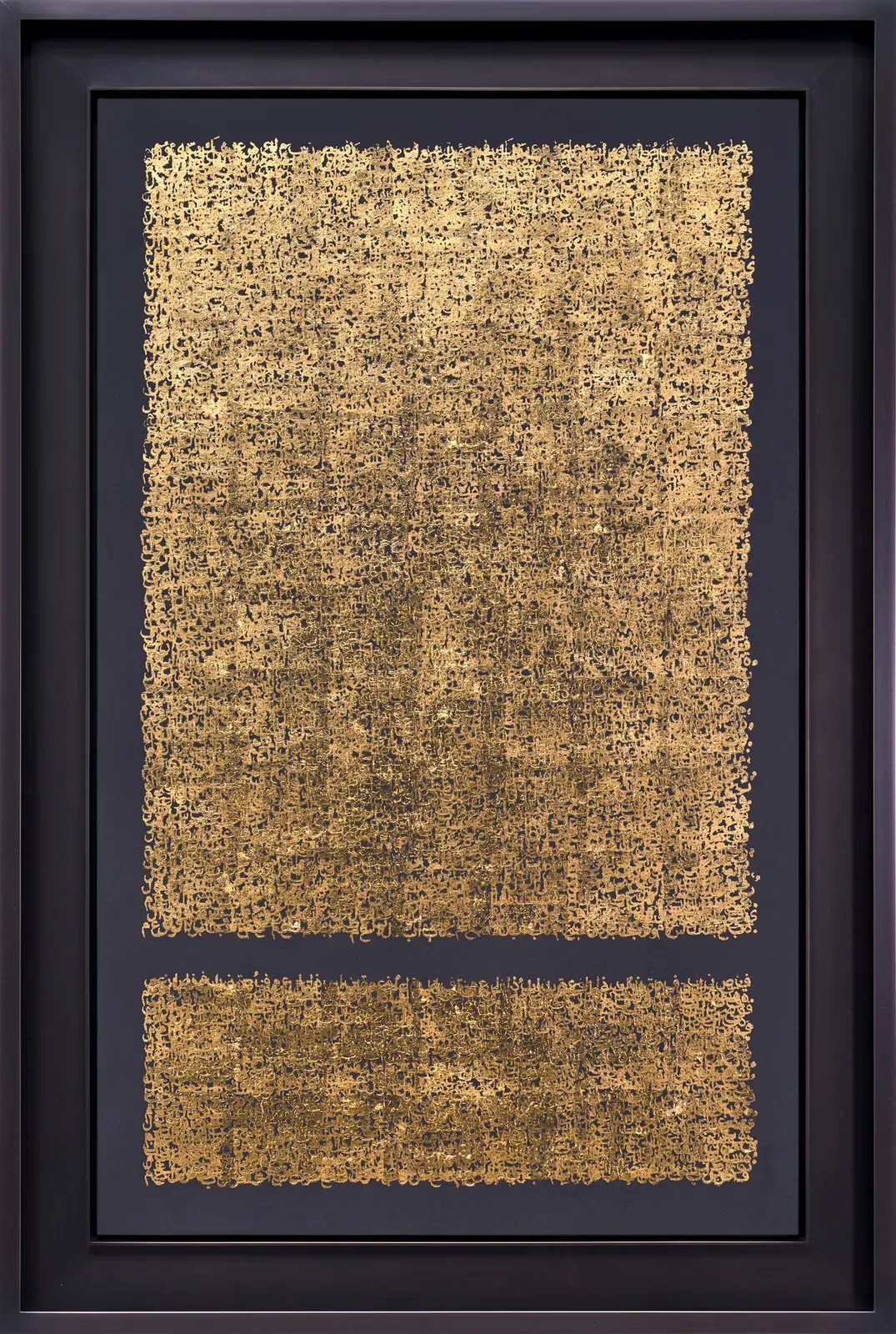 Idris Khan,Time Present, Time Past (Kiswah III), 2025, Oil based ink and 23ct gold leaf on gesso,图片由Victoria Miro画廊提供Victoria Miro画廊呈现了汗(Idris Khan)的《当下之时,过往之时》(Time Present, Time Past)系列,将标价4.5万至9万英镑的作品与《蓝色古兰经》(Blue Qur'an)的历史传统对接。汗从艺术史、音乐以及关键的哲学与神学文本中汲取灵感,因探讨记忆、创造力与经验层叠的作品而广受赞誉。这次展出的系列面板以珠宝般的色调绘就,并点缀以金箔,延续了艺术家对色彩、重复以及抽象精神潜力的持续探索,并特别致敬了伊斯兰文化丰富的传统。这种对“金色”的运用,在此处超越了装饰性的视觉符号,转化为一种对神圣历史与时间厚度的当代重塑。