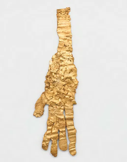 Georg Baselitz,Die Hand von Wols,2019,图片由白立方画廊提供白立方展示了巴塞利兹(Georg Baselitz)于2019年创作的《艺术家之手》(Artist's Hand)金色作品,标志着他在休整六年后重返雕塑领域。这些青铜浮雕最初在工作室里用塑胶泥捏塑而成,巴塞利兹曾表示,他渴望亲手触摸并掌控物质。放大后的作品采用古老的“火法镀金”工艺,这是一种将黄金融入表面的传统技法。在艺术家看来,这种发光的深度与色泽远比任何油漆表面更具生命力。