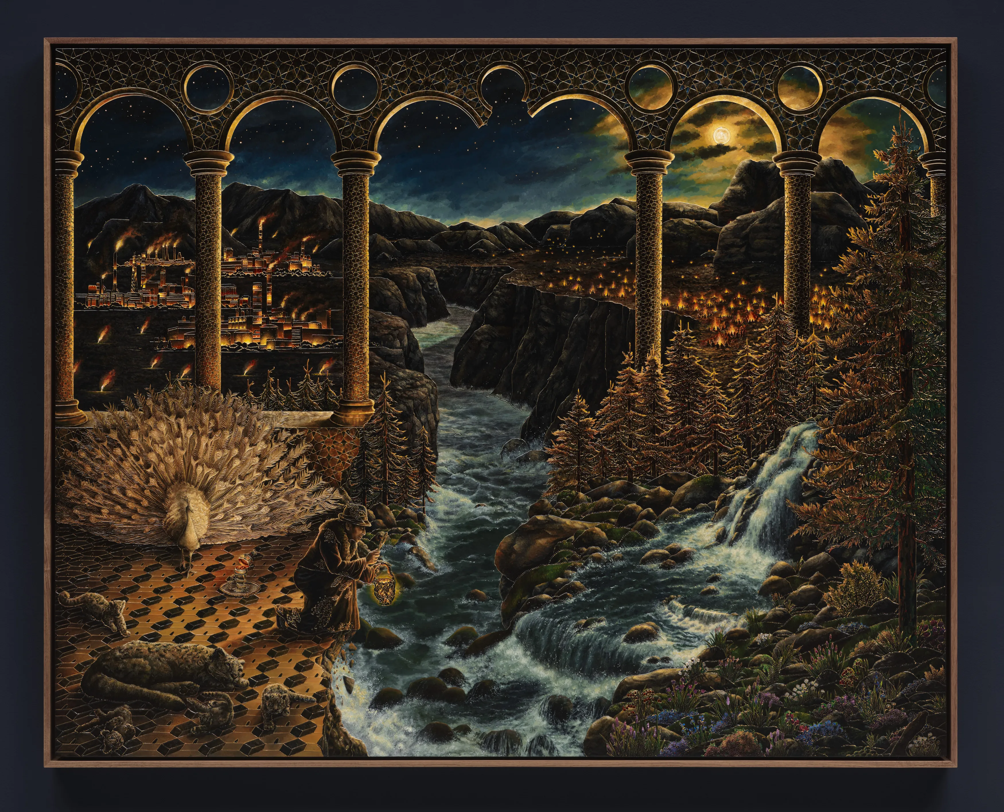 Raqib Shaw,Echoes Over Arabia I, 2025,Acrylic liner and enamel on birch wood,109x137x5.5cm © Raqib Shaw,摄影:Eva Herzog,图片由Thaddaeus Ropac画廊提供。蓝筹画廊固然会带来他们的当家明星艺术家,但在选件上显然经过了深思熟虑,而非随机的商业堆砌。Thaddaeus Ropac画廊带来了印度裔艺术家肖(Raqib Shaw),其作品《阿拉伯回响》(Echoes Over Arabia)在主题上与此地严丝合缝,充满了对地域文化的精准致敬。贝浩登(Perrotin)则选择了出生于伊朗的画家巴尼萨德尔(Ali Banisadr),而非那些与该地区毫无联系的西方名号。画廊主们在试图跨越界限,将最具分量的创作力量与这片土地的脉动联系起来。这种努力值得更公正的分析。