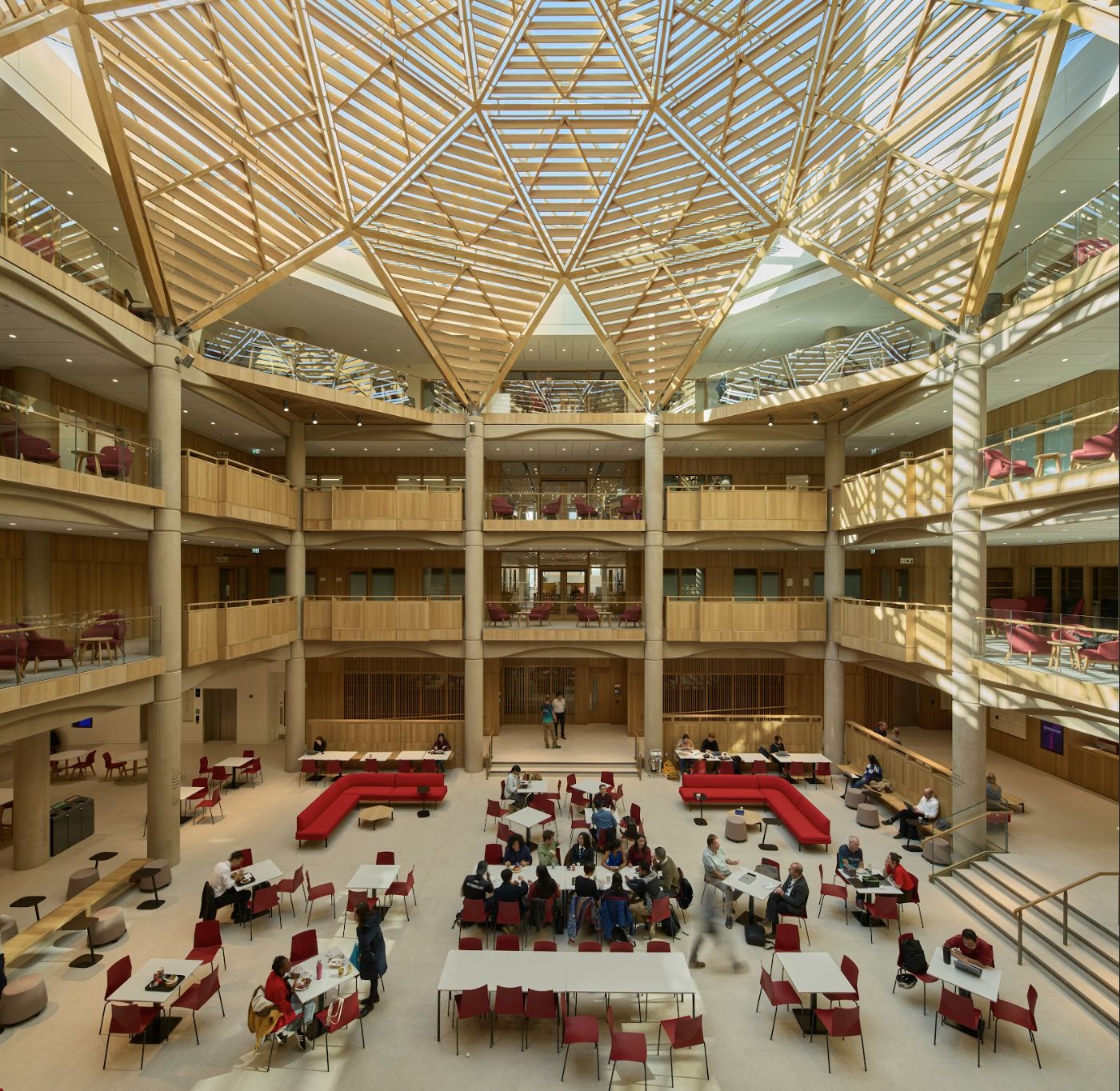 四层楼高的中庭大礼堂(Great Hall),实现了尼古拉斯•霍克斯穆尔(Nicholas Hawksmoor)在 18 世纪想要在城市中创建“大学论坛(university forum)”的雄心,又让人联想起莎士比亚环球剧院,这个开放空间可用于展览、讲座、表演或宴会。 如八卦阵的玻璃穹顶,阳光洒下来,形成错落有致的图案,木质的拱顶,红色的座椅,圆弧曲面和方正直线的自然过渡,给人一种清新舒朗自然的视觉印象。环绕大礼堂的是宽阔的走廊,各院系入口分布于四个方向,上方设有学习隔间,在这里读书、讨论、静思、默想,空气中流动着书卷气。